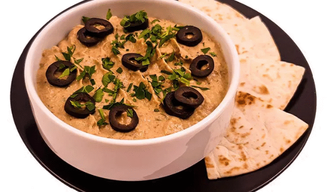 Dodati zgnječeni beli luk, tahini, limunov sok, maslinovo ulje, so i po želji malo kumina. Dobro sve izmešati. Namaz sipati u plitku činiju, napraviti malu udubinu u sredini i preliti s nekoliko kapi maslinovog ulja. Posuti seckanim peršunom i mlevenom paprikom ili sumakom.