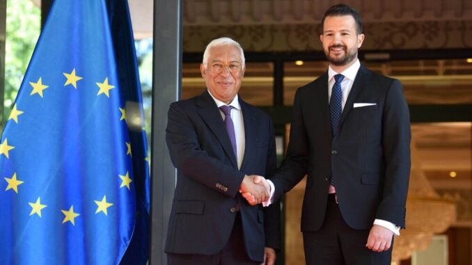 epa12099127 Montenegro's President Jakov Milatovic (R) and the European Council President Antonio Costa (L) shake hands ahead of their meeting in Podgorica, Montenegro, 14 May 2025. EPA/BORIS PEJOVIC