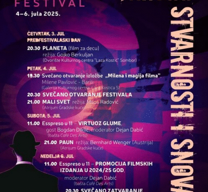 Svečano otvaranje festivala biće održano u petak, 4. jula, a program započinje u 19.30 časova otvaranjem izložbe „Milena i magija filma“, posvećene Mileni Pavlović Barili, u Galeriji Kulturnog centra „Laza Kostić“.