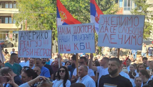 Nosili su transparente na kojima je pisalo „Želimo da se slobodno lečimo“, „Naši doktori, naši pacijenti, naš KBC“, „Dalje ruke od bolnice“, „Ameriko reaguj, Srbi nestaju“ i „Evropo zaštiti naša prava“. Nakon skupa radnici su se vratili na svoja radna mesta.