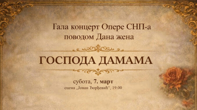 U susret Međunarodnom danu žena, publiku u Novom Sadu očekuje nesvakidašnji muzički događaj. Solisti, Orkestar i Hor Opere, zajedno sa članovima Baleta SNP-a održaće 7. marta Gala koncert posvećen svim Novosađankama pod nazivom „Gospoda damama“. Koncert se održava na sceni „Jovan Đorđević“ od 19 sati.