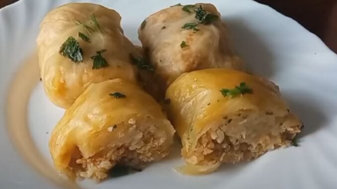 Na svaki list kupusa staviti 1–1,5 kašiku fila. Preklopiti bočne strane i čvrsto uviti. Ne prepunjavati, jer pirinač bubri tokom kuvanja.